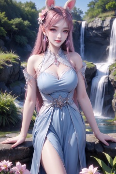 1girl,pink hair,animal ears,waterfall,water,brown hair,blue gorgeous dress,flower,smile,solo,<lora:FaceSizeAdjuster:-1.5>,