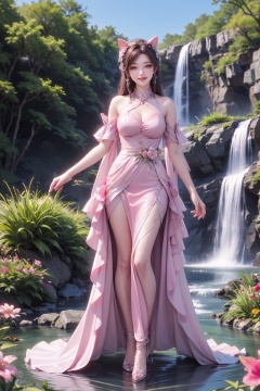1girl,pink hair,animal ears,waterfall,water,brown hair,blue gorgeous dress,flower,smile,solo,full body,