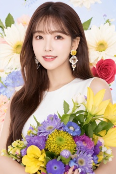 裴希西, 1girl, solo, flower, brown hair, earrings, jewelry, long hair, smile, yellow flower, bouquet, looking at viewer, pink flower, brown eyes, blue flower, floral background, upper body, sleeveless, realistic, lips, orange flower, purple flower, rose, bangs, dress