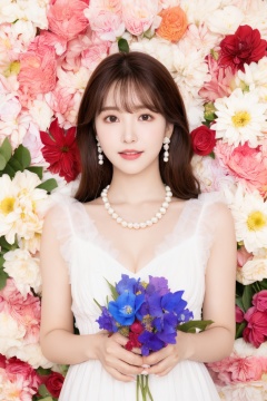 裴希西, 1girl, jewelry, solo, flower, brown hair, earrings, necklace, own hands together, pearl necklace, brown eyes, dress, realistic, white flower, smile, yellow flower, upper body, looking at viewer, pink flower, long hair, own hands clasped, parted lips, white dress, rose, red flower, floral background, blue flower