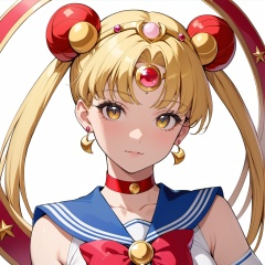 masterpiece,best quality,highly detailed,yellow hair,sailor moon,1girl,solo,twintails,sailor senshi uniform,upper body,crescent earrings,blue sailor collar,red choker,circlet,double bun,elbow gloves,white gloves,magical girl,looking at viewer,simple background,white background,