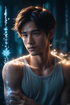 The image should be infused with the distinct qualities of a shot taken on a Canon 5D Mark IV with Kodak Ektar film - the colors are deep and resonant,the details are sharp yet possess an organic quality,and there's a subtle grain that adds a layer of depth and authenticity. This isn't just a photograph; it's a moment of raw emotion,frozen in time,inviting the viewer to not just see,but to feel.(masterpiece, top quality, best quality, beautiful and aesthetic:1.2),photo realistic, cinematic scene,advanced digital art,cyberpunk,lens flare,atmosphere,glow,detailed,intricate,a young man