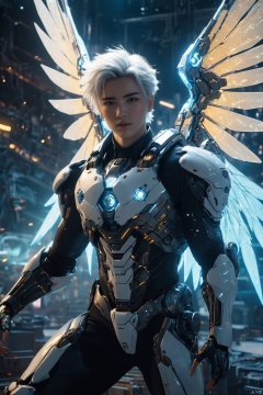The image should be infused with the distinct qualities of a shot taken on a Canon 5D Mark IV with Kodak Ektar film - the colors are deep and resonant,the details are sharp yet possess an organic quality,and there's a subtle grain that adds a layer of depth and authenticity. This isn't just a photograph; it's a moment of raw emotion,frozen in time,inviting the viewer to not just see,but to feel.(masterpiece, top quality, best quality, beautiful and aesthetic:1.2),photo realistic, cinematic scene,advanced digital art,cyberpunk,lens flare,atmosphere,glow,detailed,intricate,A handsome young man sits in a space with a sense of technology, with many 4090 graphics cards in the background,Large sci-fi background, sci-fi masterpiece, a handsome white haired young man with glowing mecha wings behind his back, flying in nebula space