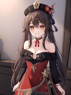 girl,hu tao (genshin impact),hat,flower on hat,brown hair,twintails,smile,dress,long hair,off-shoulder dress,ahoge,looking at viewer,red dress,bare shoulders,grin,red eyes,flower-shaped pupils,blush,bangs,breasts,choker,collarbone,solo,nail polish,black nails,ribbon choker,bow,hair between eyes,hair ornament,sidelocks,cleavage,wrist ribbon,very long hair,teeth,cowboy shot,<lora:[角色]-[胡桃-原神]hutao_v2:0.7>,, (best quality),((masterpiece)),