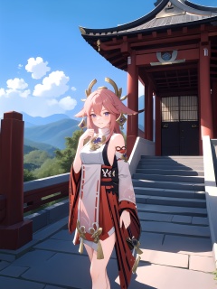 <lora:[角色]-[八重神子-原神]yaemiko1-000008:1>,yaemikodef,upper body,smile,blush,outdoors,day,simple background,blue sky,short hair,sky,temple,looking at viewer,stairs,mountain,moody lighting,facing viewer,, (best quality),((masterpiece)),