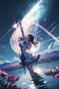 extremely delicate and beautiful,8k wallpaper,illustration,dynamic angle,a complicated sky,flowers in the mirror and moon in the water,lake,flashing rainbow,horizon,stand on the water,lens flare,bloom,hdr,lens flare abuse,caustics,sparkle,dramatic shadow,reflection,