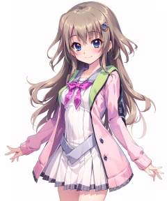 kujoumiyako,kujoumiyako school uniform,brown hair,blue eyes,(looking at viewer:1.2),cowboy shot,smile,blush,pink jacket,, masterpiece,best quality,
