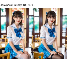 TTL,1girl,solo,school uniform,skirt,long hair,sitting,crossed legs,blue skirt,serafuku,pantyhose,looking at viewer,sailor collar,short sleeves,crossed arms,indoors,pleated skirt,realistic,bangs,bow,shirt,blue bow,cosplay,brown eyes,window,white shirt,chair,brown hair,blue bowtie,blurry background,closed mouth,bowtie,black hair,blurry,lips,blunt bangs,masterpiece best quality photograph,dynamic angle,golden ratio,1girl,waitress girl in Chinese restaurant,cleavage,holding large tray,floral pattern silk Cheongsam,smile,bamboo,studio lightning,((poakl)),<lora:poaklFixBodySDXL:0.8>,