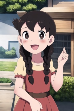 HDR,UHD,best quality,Highly detailed,masterpiece,Professional,<lora:yuanjingxiang:0.7>,yuanjingxiang,(loli:1.3),1girl,solo,long hair,looking at viewer,blush,smile,open mouth,black hair,dress,upper body,braid,black eyes,twin braids,