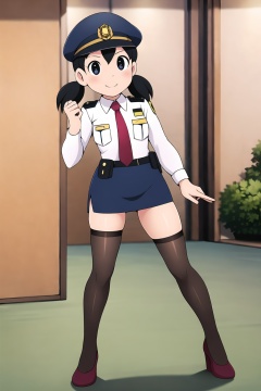 HDR,UHD,best quality,Highly detailed,masterpiece,Professional,<lora:yuanjingxiang:0.7>,yuanjingxiang,1girl,solo,looking at viewer,smile,skirt,black hair,hat,twintails,standing,necktie,uniform,black eyes,short twintails,pencil skirt,police,police uniform,policewoman,(stirrup_legwear:1.4),miniskirt,loli,