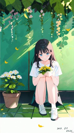 1girl, solo, flower, leaf, plant, knees up, sitting, black hair, long hair, holding flower, bangs, dated