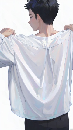 1boy, male focus, solo, black hair, looking back, back, from behind, short hair, **********, shirt, white background, muscular, muscular male, white shirt, looking at viewer