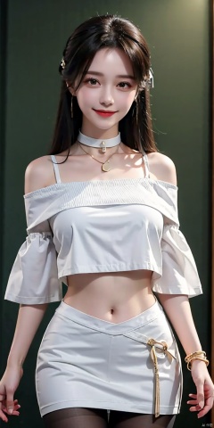 nai3, 1girl, solo, crop top, choker, miniskirt , navel, shirt, midriff, crop top overhang, looking at viewer, white shirt, jewelry, breasts, cowboy shot, bare shoulders, off-shoulder shirt, off shoulder, black choker, thighs, stomach, hand on own thigh, long hair, bracelet, short sleeves, ribbon, hand up, collarbone, hair ribbon, medium breasts, standing, , , bra strap, kind smile, hair ornament, thigh gap, bangs, necklace, expressionless,,kind smile , , blackpantyhose, , Dynamic pose,, liushen