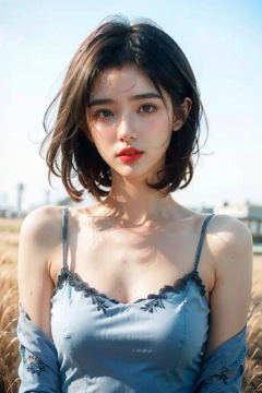 masterpiece,ultra high res,realistic,finely detail,extremely detailed,1girl,short hair,white hair,upper body,looking at viewer,pure color background,medium breasts,lipstick,red_lips,makeup,lips,film grain,film overlay,morning glow,pastel sky,cool tones,sun rays,soft light,dress,cowboy shot,