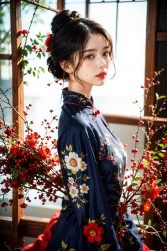 masterpiece,ultra high res,realistic,finely detail,extremely detailed,1girl,solo,brown_hair,black_hair,hair_ornament,brown_eyes,jewelry,(full body:1.3),flower,earrings,hair_bun,blurry,from_side,chinese_clothes,looking_up,freckles,standing,lipstick,red_lips,makeup,lips,