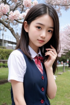 1girl,upper body,outdoor,school uniform,under the peach blossom tree with many flowers blooming again