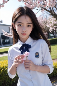 1girl,upper body,outdoor,school uniform,blossoms,falling_petals,