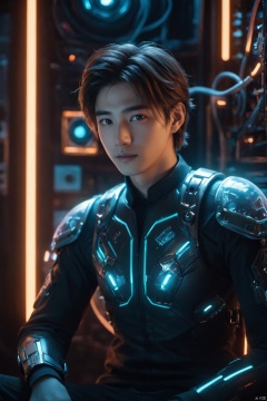The image should be infused with the distinct qualities of a shot taken on a Canon 5D Mark IV with Kodak Ektar film - the colors are deep and resonant,the details are sharp yet possess an organic quality,and there's a subtle grain that adds a layer of depth and authenticity. This isn't just a photograph; it's a moment of raw emotion,frozen in time,inviting the viewer to not just see,but to feel.(masterpiece, top quality, best quality, beautiful and aesthetic:1.2),photo realistic, cinematic scene,advanced digital art,cyberpunk,lens flare,atmosphere,glow,detailed,intricate,A handsome young man sits in a space with a sense of technology, with many 4090 graphics cards in the background