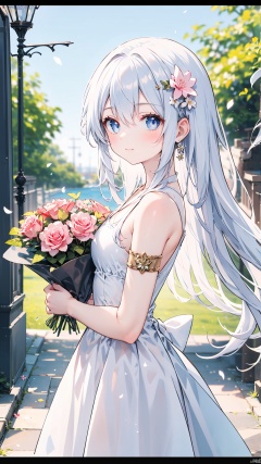 solo, 1girl, dress, flower, blue eyes, looking at viewer, long hair, hair ornament, white dress, hair flower, holding, bangs, white hair, bouquet, armlet, pink flower, sleeveless dress, bare shoulders, from side, sleeveless, holding bouquet, outdoors, breasts, rose, blush, closed mouth