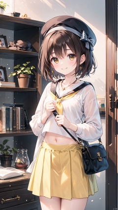 1girl, solo, brown hair, shirt, white shirt, skirt, jewelry, navel, midriff, smile, looking at viewer, short hair, brown eyes, hat, plant, earrings, jar, indoors, bag, collarbone, crop top, pleated skirt, hat bow, brown headwear, holding, necklace, brown bag, long sleeves, book, closed mouth, yellow skirt, standing, bow, cowboy shot, shoulder bag, window, clock, potted plant, blush, neckerchief, sunlight, light particles, bangs, bookshelf, yellow neckerchief