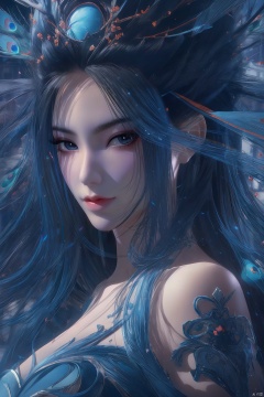Best Quality, masterpiece, ultra-high resolution, (photo realistic: 1.4) , Surrealism, Fantastical verisimilitude, beautiful blue-skinned goddess Phoenix Peacock on her head, fantastical creation, thriller color scheme, surrealism, abstract, psychedelic, 1 girl,flower,castle,jyy-hd,1 girl,mds-hd,xwhd,yx-hd,dzn-hd,mxt-hd, qy-hd, ty-hd, ylj-hd