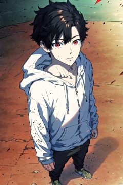 solo, looking at viewer, short hair,red eyes, black hair, 1boy, male focus,hoodie
