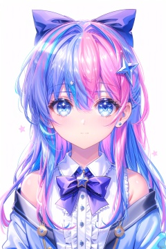 1girl, solo, long hair, looking at viewer, blush, bangs, blue eyes, simple background, shirt, hair ornament, white background, bow, ribbon, hair between eyes, bare shoulders, closed mouth, blue hair, jacket, white shirt, upper body, pink hair, hair bow, grey hair, multicolored hair, frills, collared shirt, hand up, star \(symbol\), streaked hair, symbol-shaped pupils, v, black bow, buttons, portrait, close-up, dot nose, symbol in eye, v over eye, star in eye