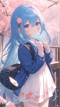 The image features a beautiful anime girl dressed in a flowing white and red dress, standing amidst a flurry of red cherry blossoms. The contrast between her white dress and the red flowers creates a striking visual effect. The lighting in the image is well-balanced, casting a warm glow on the girl and the surrounding flowers. The colors are vibrant and vivid, with the red cherry blossoms standing out against the white sky. The overall style of the image is dreamy and romantic, perfect for a piece of anime artwork. The quality of the image is excellent, with clear details and sharp focus. The girl's dress and the flowers are well-defined, and the background is evenly lit, without any harsh shadows or glare. From a technical standpoint, the image is well-composed, with the girl standing in the center of the frame, surrounded by the blossoms. The use of negative space in the background helps to draw the viewer's attention to the girl and the flowers. The cherry blossoms, often associated with transience and beauty, further reinforce this theme. The girl, lost in her thoughts, seems to be contemplating the fleeting nature of beauty and the passage of time. Overall, this is an impressive image that showcases the photographer's skill in capturing the essence of a scene, as well as their ability to create a compelling narrative through their art.catgirl,loli, kanade, (\shen ming shao nv\), cozy anime, 1girl, solo, long hair, looking at viewer, hair, blurry, blurry background, blush, bangs, depth of field,cuteloli,solo,long hair,blue eyes,shirt,hair between eyes,very long hair,blue hair,standing,jacket,,shorts,school_girl,schooluniform,blue jacket,track jacket,, kanade