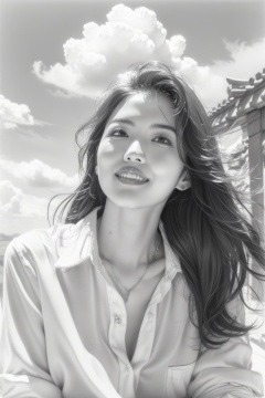 qianbihua, pencil drawing,monochrome, 1girl, solo, long hair, jewelry, sky, shirt,cloud,smile, monochrome