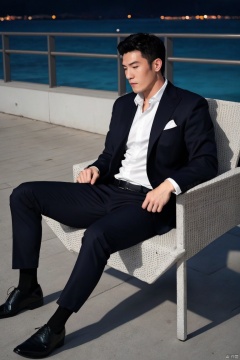 1man,fashion model,male focus,(masterpiece, realistic, best quality, highly detailed,Ultra High Resolution,Photo Art,profession),asian,exquisite facial features,handsome,deep eyes,(tuxedo,Waist seal),pants,sheer socks,footwear,sitting,night, neon, beach of city, new year, cinematic composition, neon,full body,blurry,jzns,