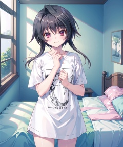 yukinoa,(yukinoa shirt:1.2),hair intakes,red eyes,black hair,cowboy shot,blush,smile,(from side:0.4),masterpiece,best quality,bedroom,bed,window,tree,cowboy shot,, masterpiece,best quality,