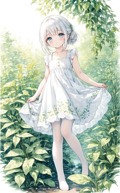 (masterpiece), (best quality), illustration, ultra detailed, hdr, Depth of field, (colorful),white pantyhose,no shoes, watercolor, masterpiece, best quality, extremely detailed, 1girl, full body, beautiful detailed eyes, cute anime face, full body, beautiful detailed face, white hair, (Botanical illustration:1.5), white dress, 1 girl, ziyi