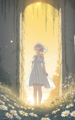 (masterpiece), (best quality), illustration, ultra detailed, hdr, Depth of field, (colorful), yellow theme, the setting sun, Chamomile, Chamomile, cornflower, vines, forest, ruins, lens flare, hdr, Tyndall effect, damp, wet, 1girl, bare shoulders, broken glass, broken wall, white hair, white dress, closed mouth, constel lation, flat color, braid, blinking, white robe, float, closed mouth, constel lation, flat color, looking up, standing, medium hair, standing, solo,