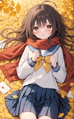 masterpiece, best quality, 1girl, solo, school uniform, skirt, scarf, lying, serafuku, on back, long sleeves, autumn, blue skirt, looking at viewer, sailor collar, bow, brown eyes, long hair, tears, autumn leaves, bangs, blue sailor collar, shirt, parted lips, pleated skirt, white shirt, envelope, ahoge, blurry, red scarf, black hair, crying, leaf, letter, crying with eyes open, yellow bow, outdoors, brown hair, bowtie, ginkgo leaf, from above, tearing up, blush,