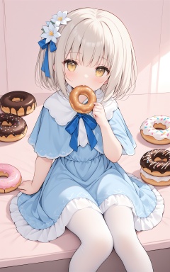 (masterpiece),(best quality),loli,1girl, solo, food, yellow eyes, doughnut, pantyhose, white pantyhose, hair ornament, sitting, looking at viewer, ribbon, flower, hair flower, dress, short hair, capelet, blue ribbon, mouth hold, bangs