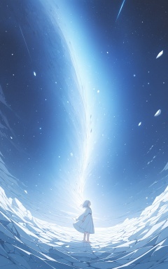 (silver, glimmer)), contrast, phenomenal aesthetic, best quality, sumptuous artwork, (masterpiece), (best quality), (ultra-detailed), (((illustration))), ((an extremely delicate and beautiful)), (detailed light), cold theme, broken glass, broken wall, ((an array of stars)), ((starry sky)), the Milky Way, star, Reflecting the starry water surface,(1girl:1.3), awhite hair, blinking, white dress, closed mouth, constel lation, flat color, white hair, braid, blinking, white robe, barefoot, float, flat color, looking up, standing, medium hair, standing, solo, space, universe, Nebula, many stars, fanxing