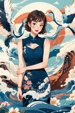 ((masterpiece)), best quality, perfect anatomy,8K wallpaper,mChinaChic, 1girl, crane \(animal\), waves, water pattern, brown hair, red lips, short hair, curls, earrings, sleeveless, leaf, smile, smoke, blush, china dress,sleeveless dress,blue dress, hairclip, floral print, flower on background,<lora:mChinaChic_v1:0.8>