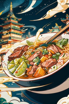 ((masterpiece)), best quality, perfect anatomy,8K wallpaper,mChinaChic, no humans, architecture, food focus, food, east asian architecture, noodles, leaf, green vegetables, cloud, bowl, steam, picking up noodles with chopsticks, smoke, meat, Roujiamo, vegetable, building, soup, wide noodles, spring onion, night sky, starry sky, chinese text on bowl<lora:mChinaChic_v1:0.8>