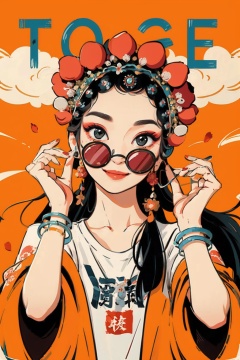 ((masterpiece)), best quality, perfect anatomy,8K wallpaper,mChinaChic, 1girl, solo, jewelry, black hair, long hair, chibi, Chinese opera coronal, upper body, white shirt, looking at viewer, red nails, smile, red eyeshadow, round eyewear, red flower, wide sleeves, chinese text print shirt, orange background, cloud, red petals, bangle, english text<lora:mChinaChic_v1:0.8>