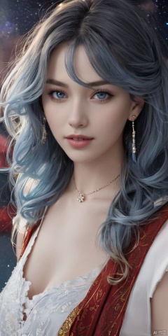 1girl, dance, Fairy, crystal, jewels,black, Crystal clear,solo, long hair, looking at viewer,black hair,jewelry, earrings,lips, makeup, portrait, eyeshadow, realistic, nose,{{best quality}}, {{masterpiece}}, {{ultra-detailed}}, {illustration}, {detailed light}, {an extremely delicate and beautiful}, a girl, {beautiful detailed eyes}, stars in the eyes, messy floating hair, colored inner hair, Starry sky adorns hair, depth of field, large breasts,cleavage,zj,