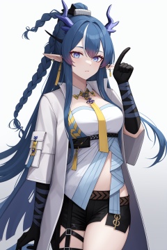 <lora:令:1:lbw=char>, ling,a girl named ling,blue hair,long hair,1girl,horns,pointy ears,dragon horns,blue eyes,jewelry,earrings,gloves,necktie,braid,open clothes,yellow necktie,coat,shorts,, (masterpiece,best quality:1.2),absurdres, high quality,