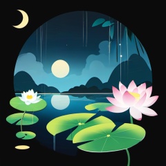 the 24 Traditional Chinese Solar Terms\(Rain Water\),flat,black background, flower, water, sweatdrop, no humans, leaf, moon, scenery, full moon, lily pad, lotus,<lora:lbc_Rain Water_XL-ts:1.2>,