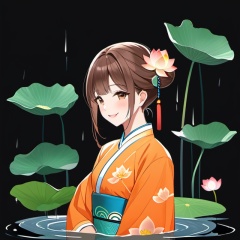 the 24 Traditional Chinese Solar Terms\(Rain Water\),flat,black background, 1girl, solo, smile, brown hair, long sleeves, flower, hair bun, leaf, chinese clothes, orange shirt, lotus,<lora:lbc_Rain Water_XL-ts:1>,