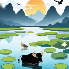 the 24 traditional chinese solar terms\(rain water\), flat, black background, outdoors, horns, sky, cloud, water, no humans, bird, animal, grass, scenery, mountain, sun, lake, lily pad, buffalo,<lora:lbc_Rain Water_XL-ts:1>,