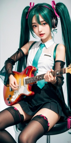 (masterpiece), (best quality), illustration, ultra detailed, hdr, Depth of field, (colorful), loli, 1girl, instrument, solo, long hair, hatsune miku, skirt, thighhighs, twintails, shirt, very long hair, detached sleeves, sitting, neck ribbon, black skirt, headphones, white shirt, ribbon, high heels, playing instrument, sleeveless shirt, aqua ribbon, pleated skirt, miniskirt, guitar, black thighhighs, holding, music, full body, sleeveless, holding instrument, aqua hair, see-through, black footwear, petals, layered sleeves, see-through sleeves, zettai ryouiki, open mouth, bare shoulders, hair between eyes, stool, black sleeves, looking at viewer, long sleeves, aqua eyes, hair ornament, nail polish, collared shirt, white sleeves, electric guitar, see-through legwear, smile, ((poakl))