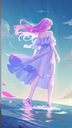 1girl, solo, long hair, dress, bare shoulders, purple eyes, collarbone,full body, pink hair, parted lips, off shoulder, white dress, floating hair, looking away, wind
