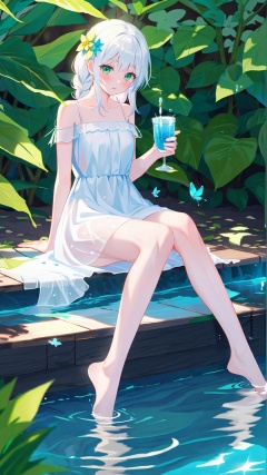 1girl, flower, feet, hair flower, barefoot, green eyes, hair ornament, toes, long hair, solo, soles, white dress, cup, holding cup, dress, butterfly, bare legs, bug, holding, blush, looking at viewer, white hair, legs, bangs, sitting, foot focus, braid, water, bare shoulders