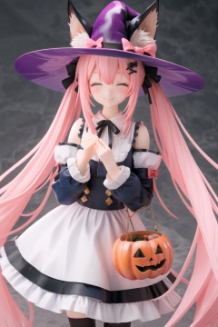 girl, solo, witch hat, shirt, hat, animal ears, white shirt, closed eyes, facing viewer, pink hair, bow, skirt, hair ornament, twintails, blush, closed mouth, polka dot scrunchie, long sleeves, cat ears, smile, halloween bucket, animal ear fluff, frilled skirt, halloween, good shade, long hair, ^ ^, bangs, pink bow, holding, bat hair ornament, black skirt, striped, striped bow, frills, sleeveless, polka dot, food, very long hair, black headwear, polka dot bow, hands up, sleeves past wrists, black bow, detached sleeves, purple bow, purple skirt, cat girl, hat bow, black sailor collar