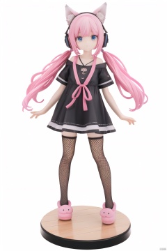 hoshi (snacherubi),(masterpiece:1.3),(the best quality:1.2),(super fine illustrations:1.2),(Masterpiece),high quality,high detail,(white background:1.2),looking at viewer,(SOLO:1.4),outline,simple background,full body, headphones,fishnets,long hair,thighhighs,headphones around neck,multicolored hair,twintails,headset,collarbone,fu hua,stuffed animal,slippers,figure,black shirt,bare shoulders,cat ear headphones,two-tone legwear,striped legwear,short sleeves,off-shoulder shirt,off shoulder,fishnet legwear,bangs,blue eyes,