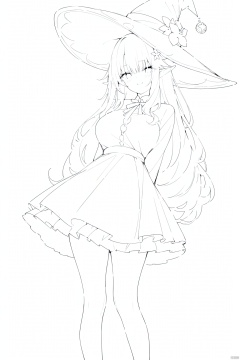 (greyscale, monochrome, sketch), (masterpiece:1.2), (arms behind back:1.2), best quality, game cg, 1girl, solo, long hair, white hair, hair ornament, dress, full body, looking at viewer, simple background, red eyes, standing, hair flower, white background, white dress, closed mouth, long sleeves, skirt, wavy hair, blush, large breasts, smile, very long hair, hand up, floral print, witch hat, elf,<lora:EMS-261615-EMS:1.000000>